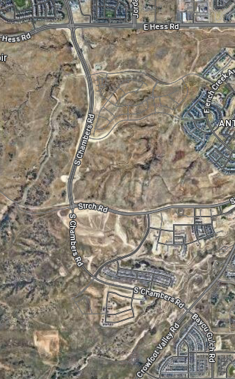 A full-blown four-lane semi-expressway now continues south from Hess, and then Chambers bends around to the southeast, crosses Crowfoot Valley Road (which runs diagonally between Parker and Castle Rock), and becomes Bayou Gulch Road, which I knew connected with Parker Road (CO 83) south of the Pinery.