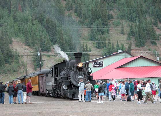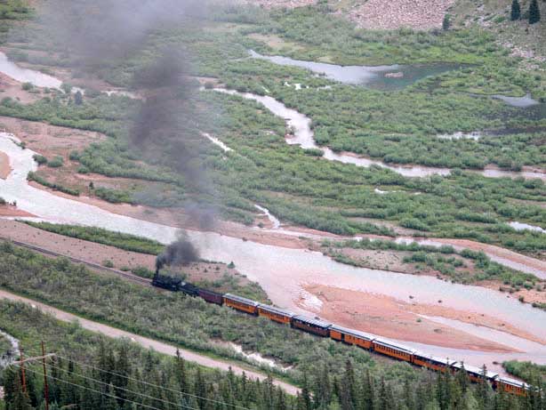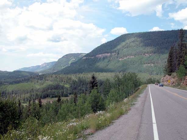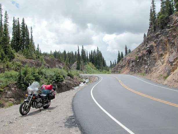 Running north from Durango, US 550 crosses first Coal Bank Pass, then Molas Pass, and descends into Silverton. From Silverton the road continues on over Red Mountain Pass and descends into Ouray. From there the road continues north to Montrose. While the ride into Silverton from either direction is itself spectacular, the northbound descent into Ouray is one of the most outstanding runs in all of Colorado. Do not miss this one if at all possible. Ouray is also a good place to end the day’s ride. The town is famous for its hot springs and a good hot soak at the end of a day on the bike is a true luxury. There is one motorcycle-accessible campground, South Mineral Campground, along this stretch of US 550, just outside of Silverton to the north. The sequence of these photos is northbound out of Durango. There are a lot of photos because this is really spectacular country. These first few are going over Coal Bank and Molas Passes: Click on thumbnail for larger image; arrow through photos; click large image to close. Here we are coming down into Silverton and just at that time the Durango & Silverton Narrow Gauge Railroad train came along, also approaching Silverton: The old mining town of Silverton is very well preserved and a big tourist draw. Once the train is in the station you can inspect it up close: Now we head on up out of Silverton over Red Mountain Pass and on to Ouray on the other side: And finally, here’s the descent into Ouray: | | |